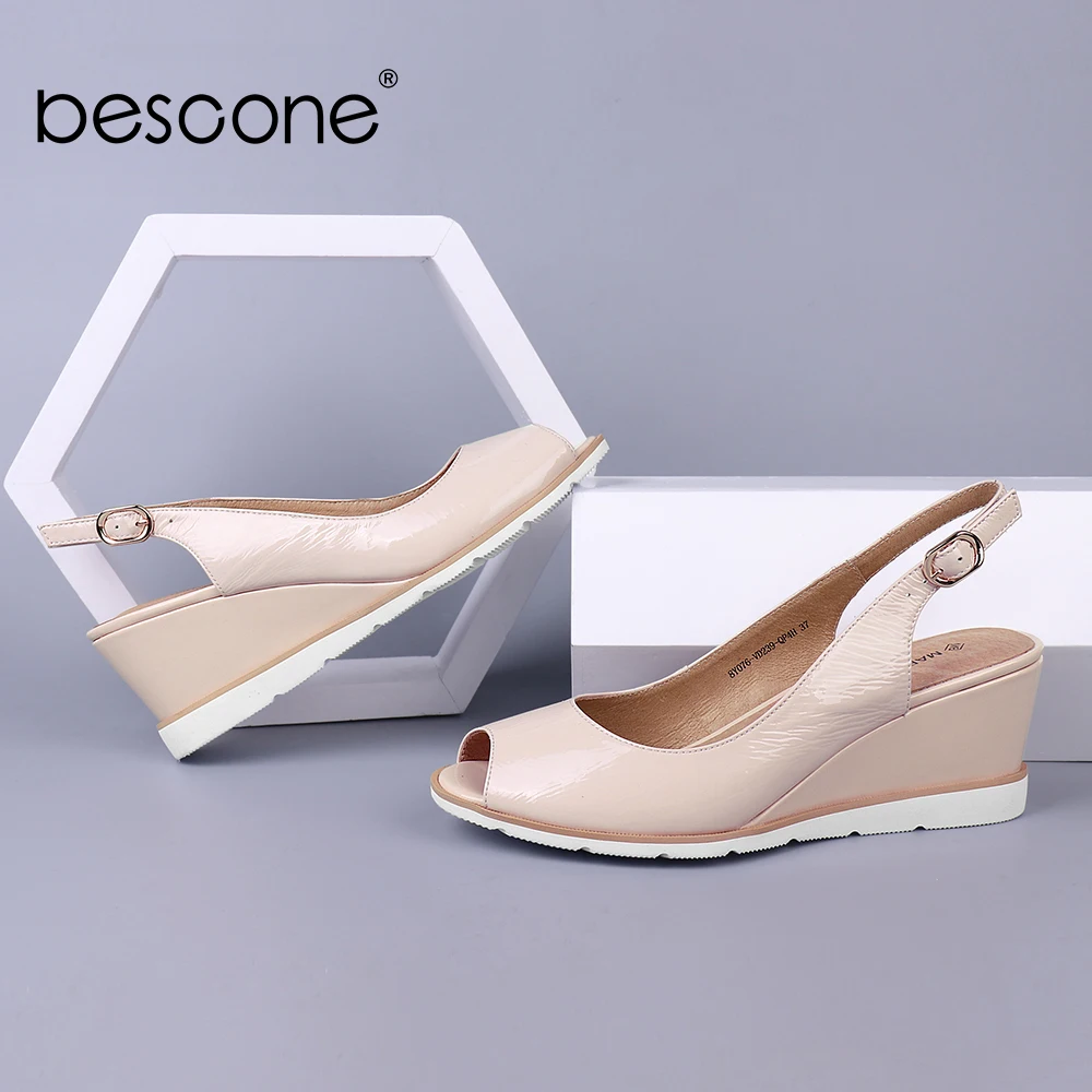 Good Price for BESCONE Women Sandals Wedges Pleated Patent Leather Apricot Peep Toe Female Summer Shoes Handmade C